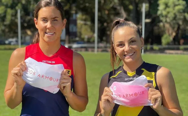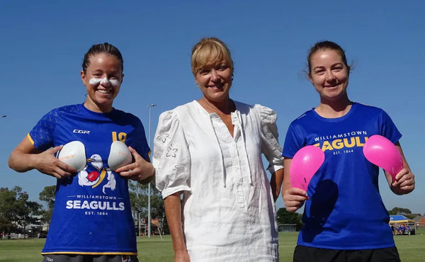 AFLW players Libby Birch and Monique Conti with Suzie Betts, Founder & Owner, Boob Armour®